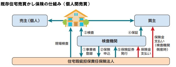 宅建業者以外の個人が既存住宅を販売する場合は、瑕疵担保責任は義務付けられておらず、また個人の売主に長期間の瑕疵担保責任を負わせることは現実的ではありません。一方で、購入者の加入するモノ保険も考えられますが、保険収支上商品化は困難になります。このため、検査機関が検査を実施し、隠れた瑕疵によって生じた買主の損害に対する保証責任を負い、当該保証責任に対して、保険法人が保険を引き受けています。